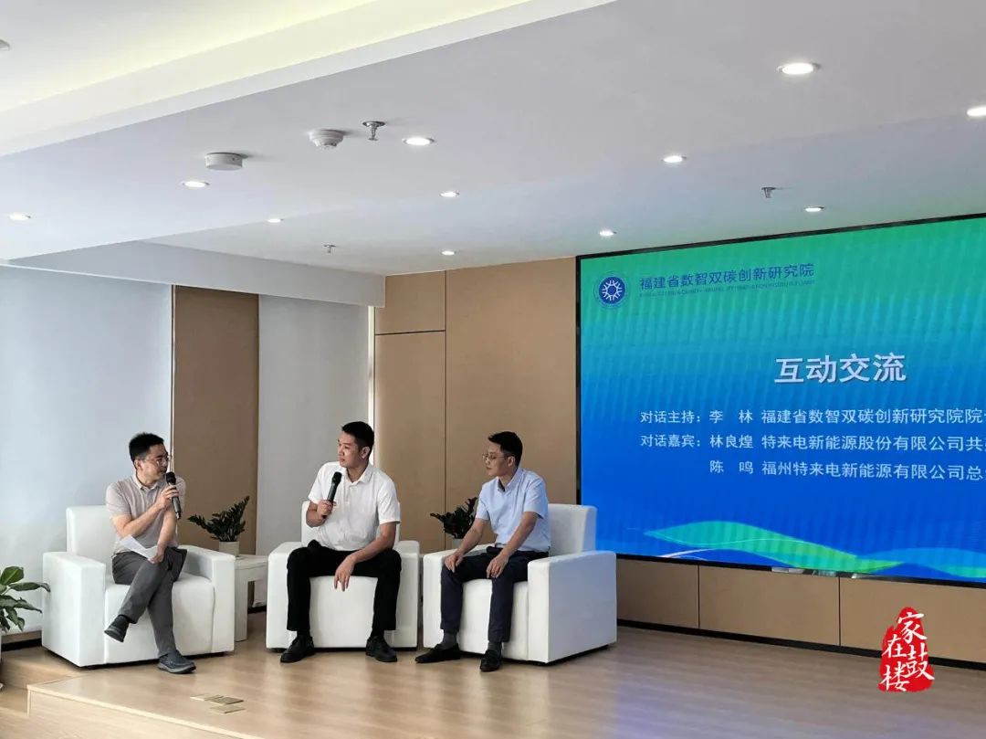 主题演讲后,林良煌与福州特来电新能源有限公司总经理陈鸣开展互动交流研讨,与会嘉宾踊跃提问,聚焦绿色低碳发展,共同探讨了低零碳园区认证如何开展、如何实现低零碳园区建设、低零碳园区中光储直柔应用的安全性以及碳中和补贴发放等,现场反响热烈。