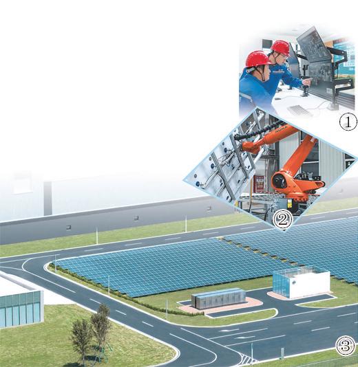 图①: 鄂尔多斯零碳产业园工业污水处理厂及水资源再生利用项目中控中心。 张 枨 苗培梁摄影报道 图②:内蒙古百川光热科技有限公司反射镜生产车间,机械手正在进行垫片粘接。 张 枨 武家伟摄影报道 图③:鄂尔多斯零碳产业园远景项目。 远景科技集团供图